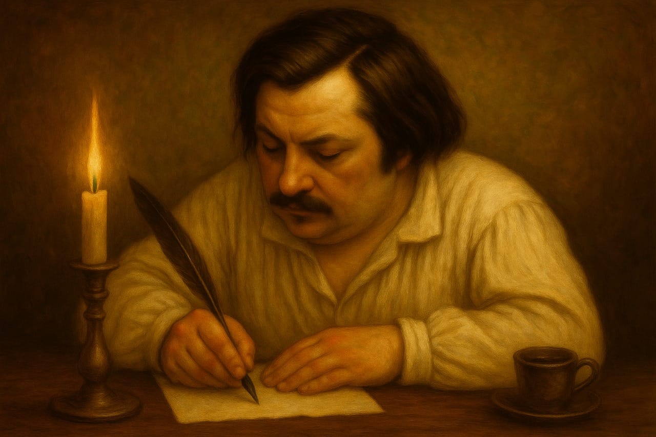يذكر بعض مَن تناولوا سيرته أنه بلغ مبلغًا كبيرًا من الإفراط في شرب القهوة، فصار يجرع الفنجان تلو الفنجان إلى حد استهلاك خمسين فنجانًا في اليوم، كانت بمثابة إنهاك لأعصابه وحرق بطيء لصحته، وكأنه في صفقة فاوستية: أعطني الإبداع الخالد، وسأمنحك عمري وحياتي. وبهذا الثمن الباهظ، تمكن من كتابة ما يزيد على تسعين رواية وقصة قصيرة في عشرين عامًا فقط، مشيّدًا صرح “الكوميديا الإنسانية” الذي ضم آلاف الشخصيات، ورسم خريطة روحية لفرنسا بأكملها.